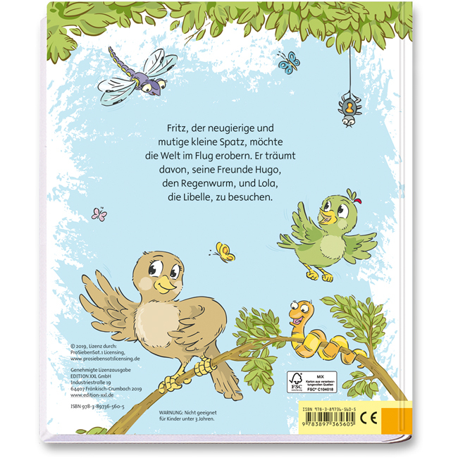 ISBN: 978-3-89736-560-5Art-Nr.: 560Umfang: 18 Seiten Maße: 20,3x24,3cm Gewicht: 467g Ausstattung: Wattiertes Cover mit partieller Folienprägung und abgerundeten EckenDiese liebevolle Geschichte schildert wie Fritz der Spatz flügge wird und seine Eltern damit umgehen. Wattiertes Cover mit abgerundeten Ecken und partieller Folienprägung.